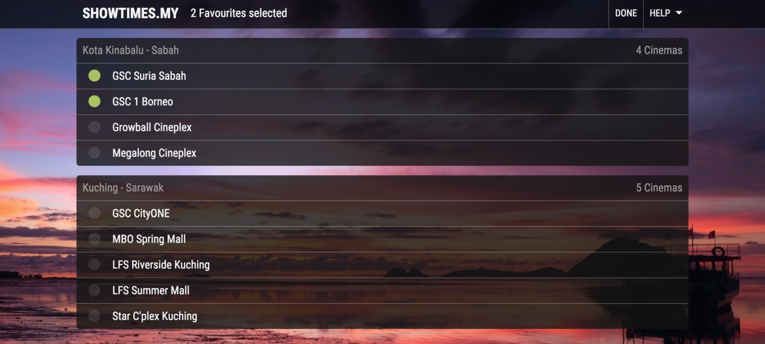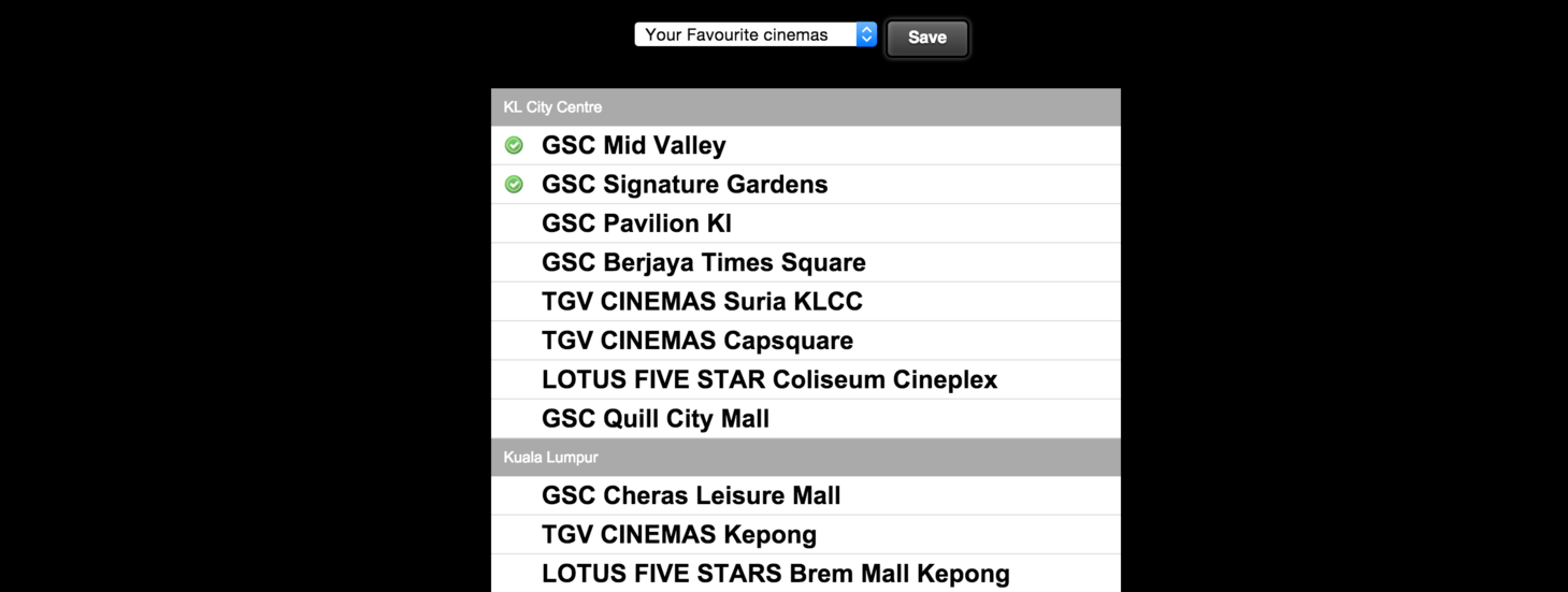 Ideally, we would want the user to see only the cinemas that interest them. So we decided to introduce a feature where users can choose their favourite cinemas and have that as a "location". This allows users to tailor the list of cinemas they see on the page.