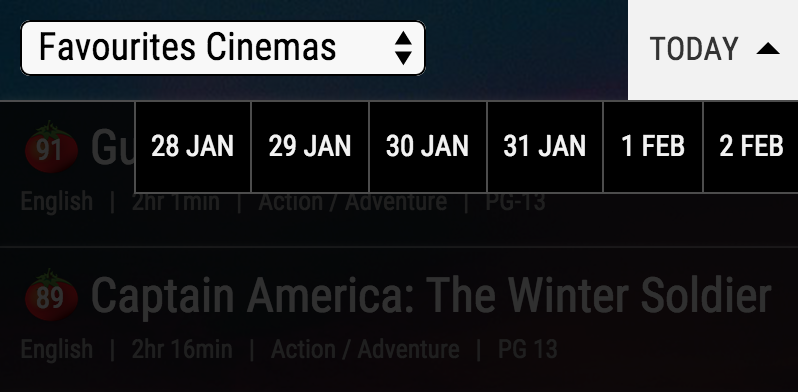 This works well for the dates because the nature of showtimes. At any one time you can access up to 7 days of movie showtimes. They are updated every week on Thursday. However, we had to revert back to a dropdown on smaller screens due to space constraints.